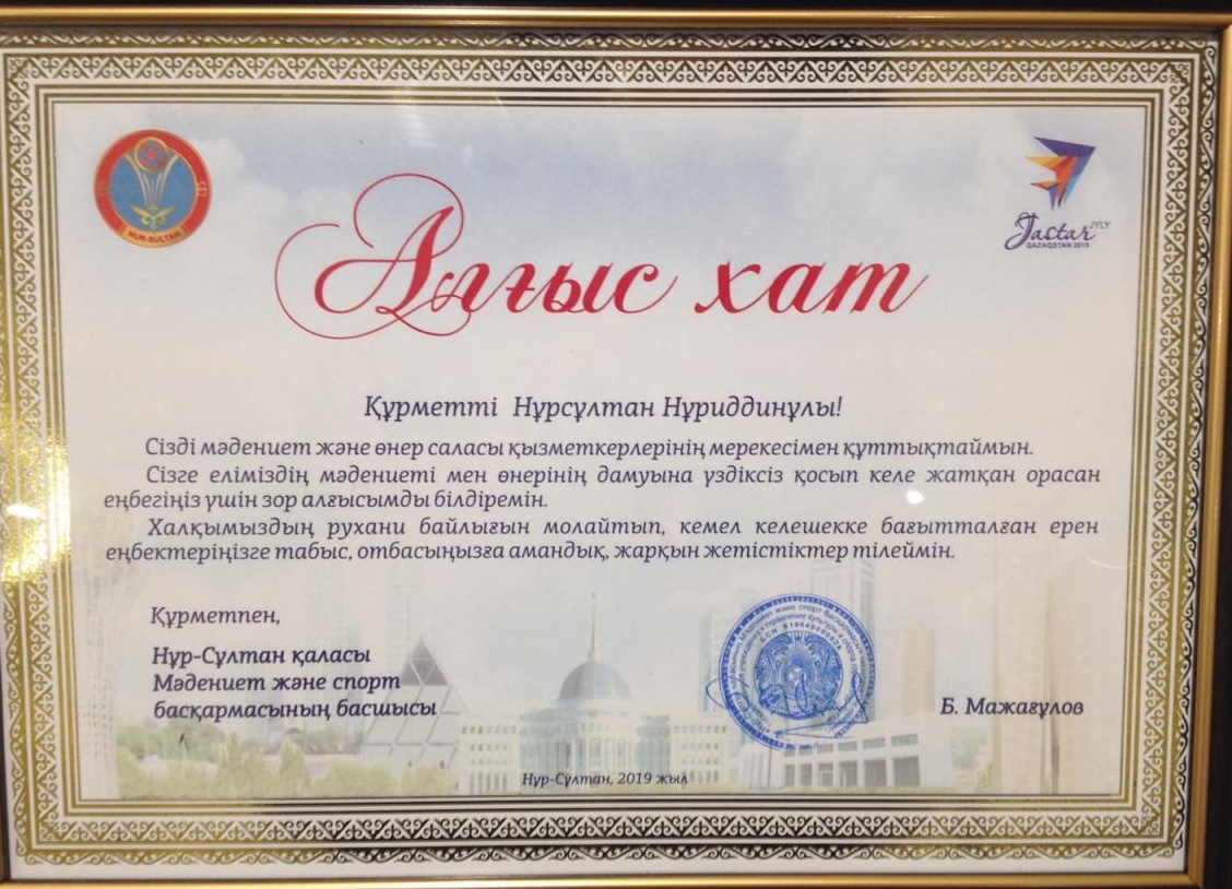 Өнер қызметкерлерінің мерекесіне орай «Номад Сити Холл» МКҚК-нің кадр маманы Бақыт Каировна, театр музыканты Нұрсұлтан Нұриддинұлы, жарықпен әрлеуші Дамир Шәріпұлы Нұр-Сұлтан қаласы Мәдениет және спорт басқармасының басшысы Б.Мажағұловтың АЛҒЫС ХАТымен марапатталды! Шын жүректен құттықтаймыз!!!