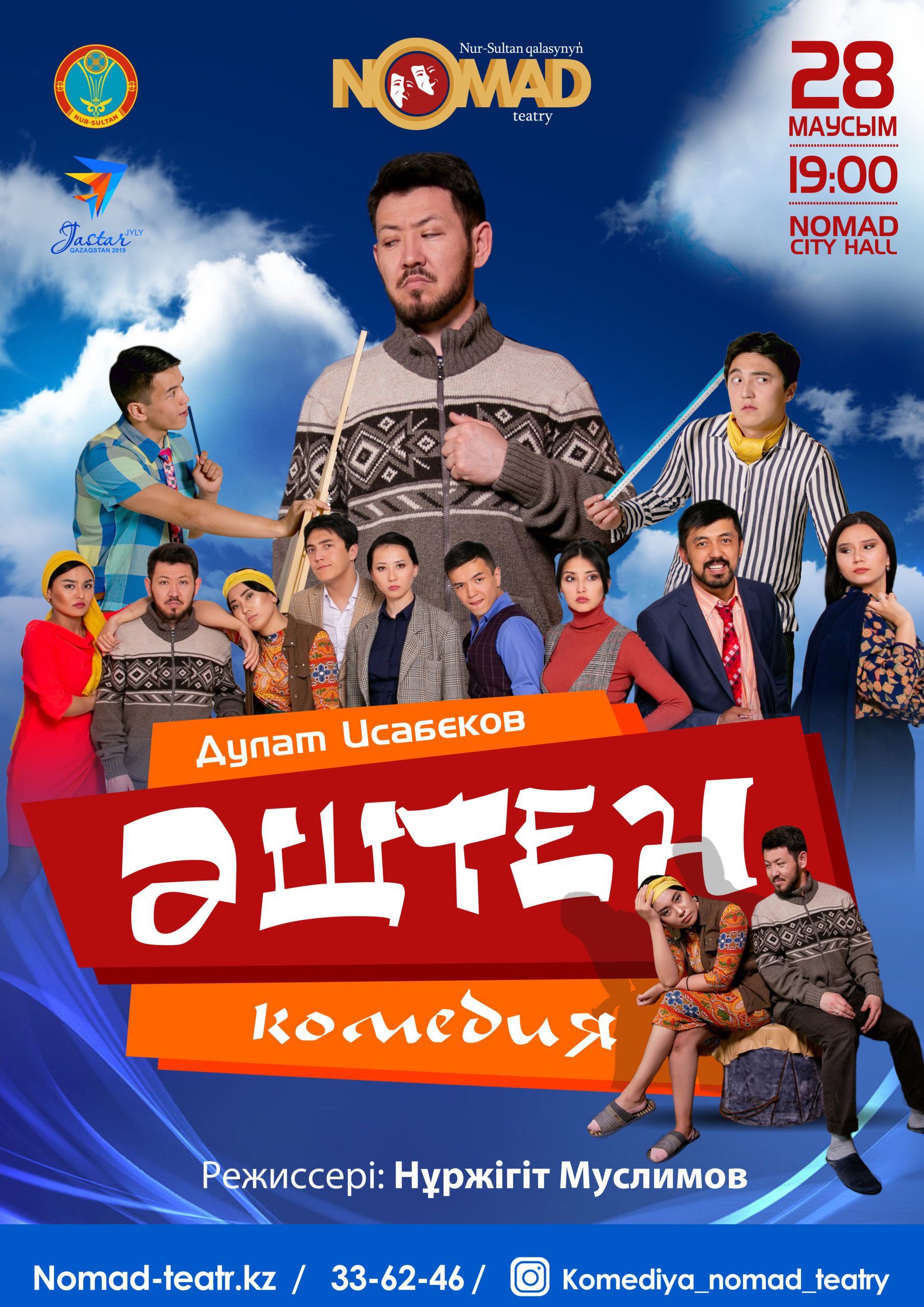 Құрметті көрермендер! 2019 жылдың 28 маусым күні, сағат 19:00-де Нұр-Сұлтан қаласының Номад театры Д.Исабековтің «Әштен» комедиясының премьерасына шақырады!